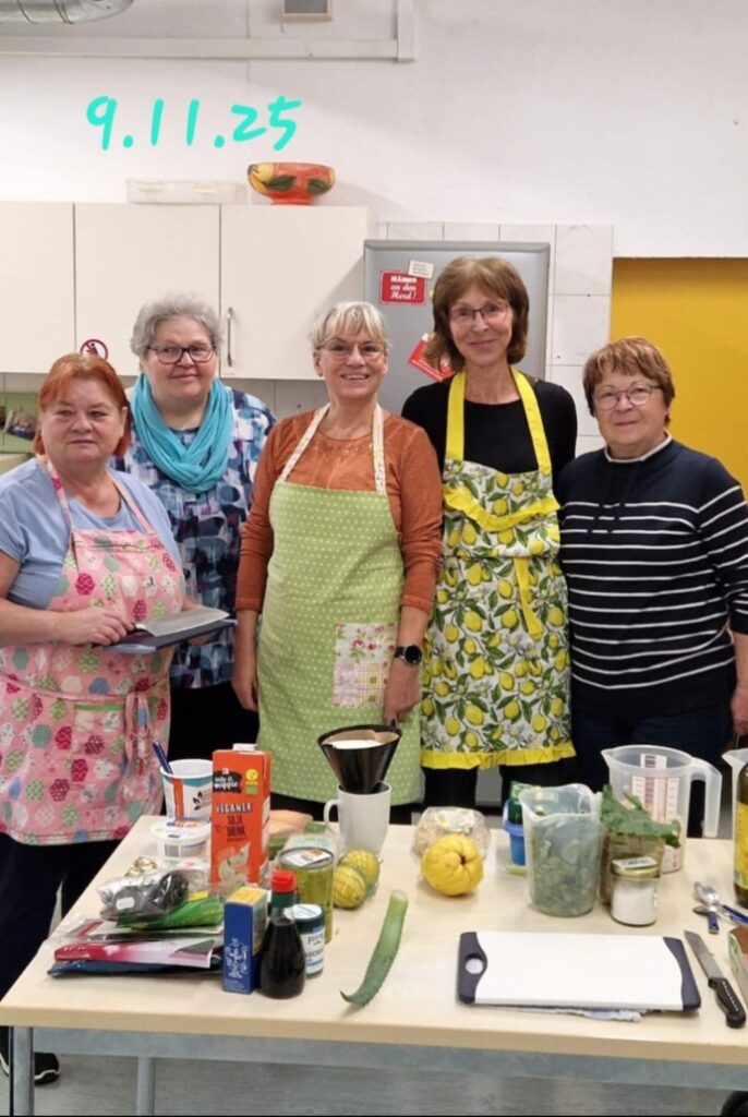 Wer sich für die vegane Küche interessiert, war hier genau richtig. Fünf Kochanwärter schlüpften in ihre Schürzen und stürzten sich mutig in ein veganes Abenteuer. Dabei waren alle Sinne gefordert. Es wurde erläutert, gekostet, gerochen und Fingerfertigkeit gefordert.