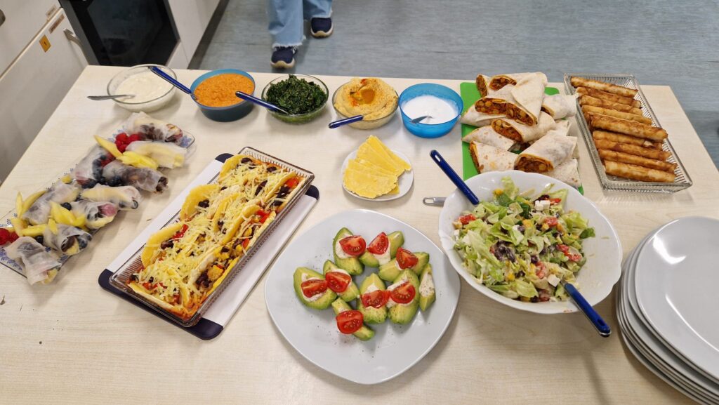 In kleinen Gruppen wurden jeweils 3-4 Rezepte bearbeitet. Salat, Wraps, Dessert, Dips, Pesto wurden gezaubert und am Ende ergab es ein sehr buntes Buffet für alle Teilnehmer. Einiges war ungewohnt für den „Normalgaumen“, aber alle haben sich neugierig durchgekostet.