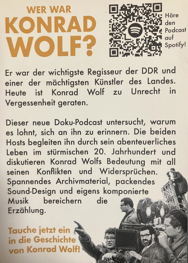 Nun wurde zum 100. Geburtstag des großen Filmregisseurs Konrad Wolf eingeladen. Studenten der Filmuniversität Babelsberg KONRAD WOLF, Johanna Deventer und Fabien Tim Meier, hatten in umfangreichen Studien einen lebhaften, spannenden Podcast zum Leben und Wirken des Namensgebers ihrer Lehrstätte produziert, der uns zunächst fassungslos machte: In ihren Umfragen unter den Studenten eben dieser Hochschule wusste kein einziger Student, wer denn Konrad Wolf sei!