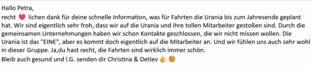 Folgende Zeilen erreichten uns über Petra Kunick. Weder Absender noch Zeitpunkt der Absendung lässt sich noch ermitteln. Uns berühren die Worte aber so sehr, dass wir sie hier teilen möchten und sagen „Danke für die lieben Worte!“.