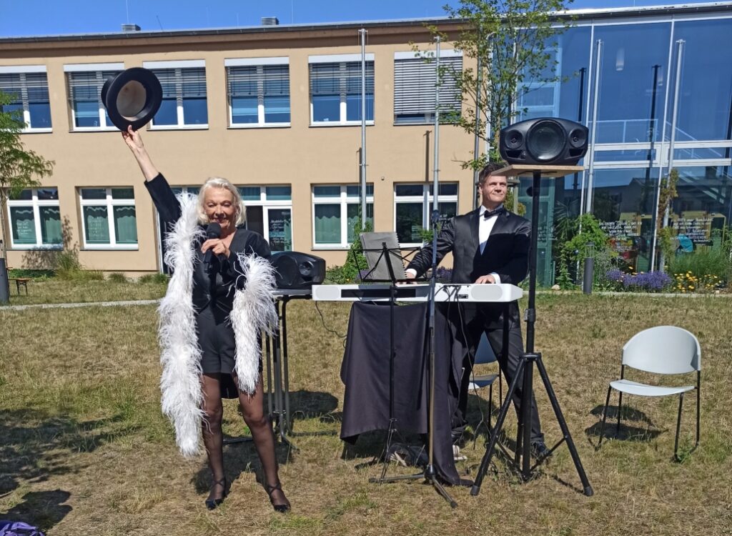 Darauf folgte ein unterhaltsames Programm mit Walpurga Raeder und Bert Mario Temme. Sie huldigten mit ihren Liedern und Redebeiträgen den beiden künstlerischen Giganten, Marlene Dietrich und Udo Jürgens. Trotz kompletter Kostümierung in unbarmherziger Sonne sprühten die Vortragenden vor Temperament und Spiellust. Das Publikum zeigte sich begeistert und ließ sich gern mitreißen.