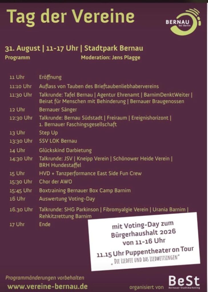 Wir haben es wieder getan: wir hatten in bekannter Tradition hatten wir einen Stand auf dem Tag der Vereine, den die Stadt Bernau im Stadtpark veranstaltet hat. Bei schönstem Wetter wurden viele nette Gespräch mit neuen und bekannten „Gesichtern“ geführt.